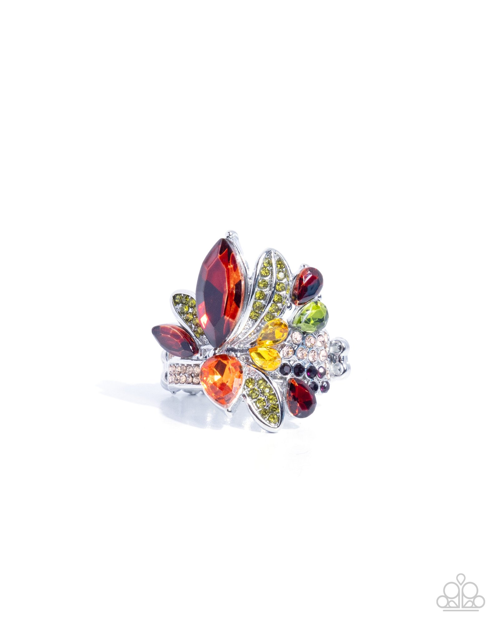 Gathering around a light peach and amethyst rhinestone-embellished silver band, a collection of multicolored teardrop and marquise-cut leaves, as well as olive rhinestone-embellished silver leaves, coalesce and cluster atop the finger for a wildly whimsical centerpiece. Features a stretchy band for a flexible fit.