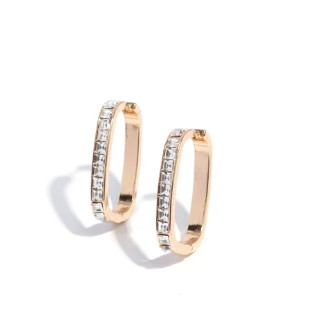Pressed in a rectangular frame of gold, a collection of faceted white square gems twinkle around the outer curve of the ear for an elevated elegant look. Earring attaches to a standard hinge closure fitting. Hoop measures approximately 1″ in diameter.