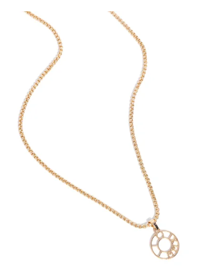 An airy, gold circular pendant featuring gold Roman numerals glides along a rounded gold box chain, resulting in a striking statement below the collar. Features an adjustable clasp closure.