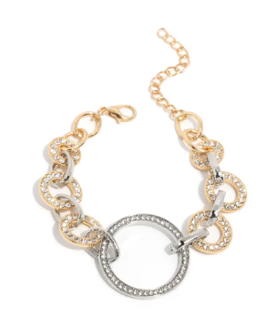 Dusted in white rhinestones, glistening gold discs interlock around the wrist, connecting to an oversized white rhinestone-bordered silver disc for a shimmery sequence. Features an adjustable clasp closure.