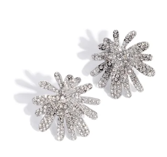 Dotted with an explosion of dainty white rhinestones, a collection of silver petals in varying sizes coalesce around a white gem center to create a dramatic daisy, elongating below the ear for a wildly whimsical centerpiece. Earring attaches to a standard post fitting.