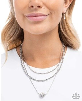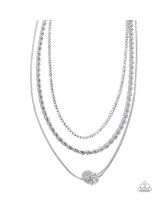 Three mismatched strands of white rhinestones in silver square fittings, a silver rope chain, and a silver snake chain coalesce below the neckline in tiers for a heartstopping haute display. A white rhinestone-dusted silver ornament glides along the lowermost chain for additional shimmer. Features an adjustable clasp closure.